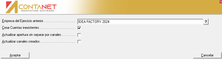 Proceso que realiza nuevamente el asiento de Apertura en la contabilidad activa. Los importes de las cuentas contables se actualizarán por los datos de la empresa (ó ejercicio anterior) que aparece por defecto, o que seleccione durante el proceso.