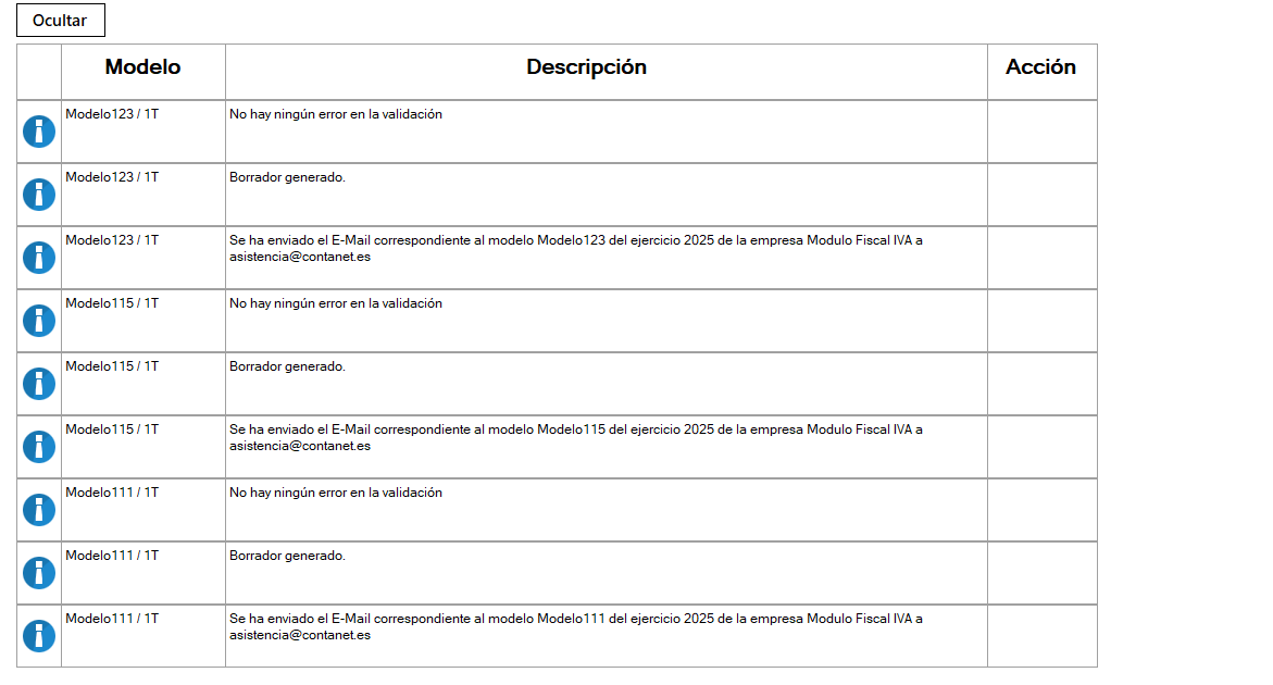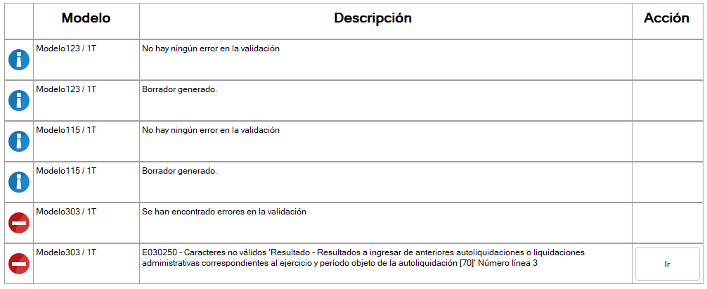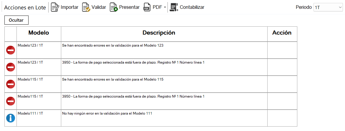 Pulse Ocultar y corrija los errores indicados. Para modelos informativos, el programa usará el certificado. Las declaraciones que estén bloqueadas (es decir, que contengan un PDF adjunto) serán visibles pero no estarán operativas en esta acción