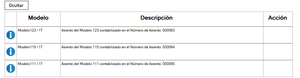 5. El último paso, Contabilizar, es opcional, realizará el apunte contable en el diario de cada modelo seleccionado. Se mostrará un listado con el nombre del modelo y el número de asiento contables asignado.