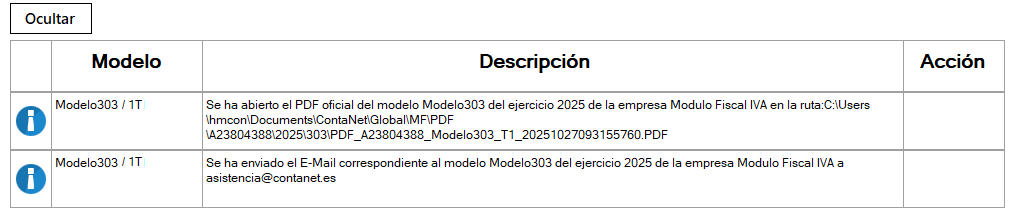 En Ver PDF, podrá ver el PDF que adjuntó y en Ver y Enviar PDF, podrá enviar por correo la declaración adjunta si lo desea. Recuerde que necesitará configurar en los Datos Fiscales de la empresa el Email. En esta ayuda se muestra donde se introduce la dirección